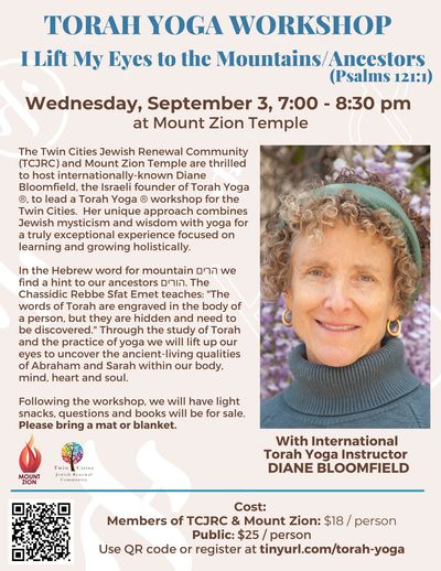 The Twin Cities Jewish Renewal Community (TCJRC) and Mount Zion Temple are thrilled to host internationally-known Diane Bloomfield, the Israeli founder of Torah Yoga®, to lead a Torah Yoga® workshop for the Twin Cities.